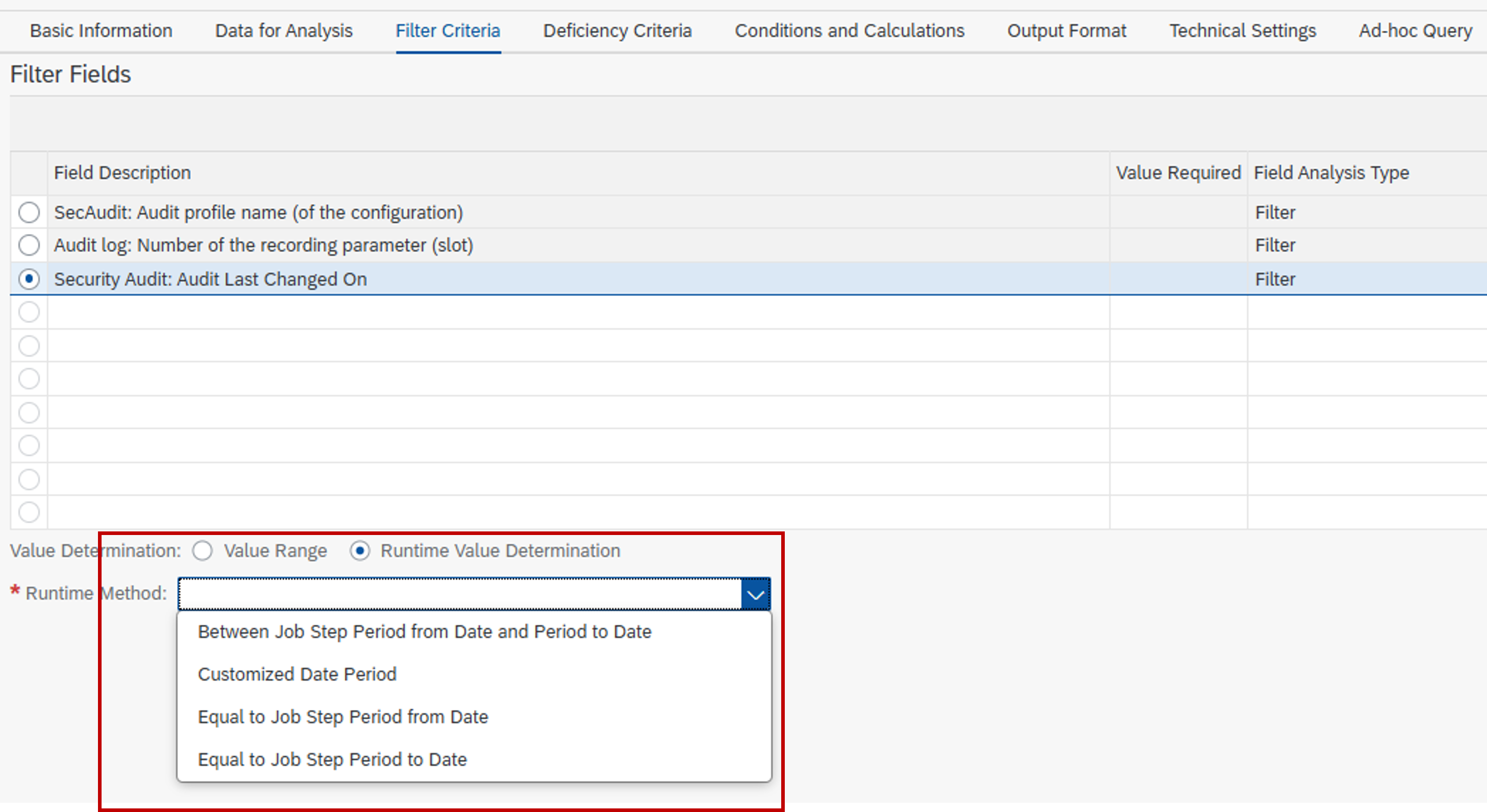 - Checking for deviations from pre-defined values, – e.g. mandated by a policy or design documents. Examples here could be changes of critical configuration (e.g. tolerance limits for three way match), or deviations from mandated values (e.g. SAP Security Baseline Template).
