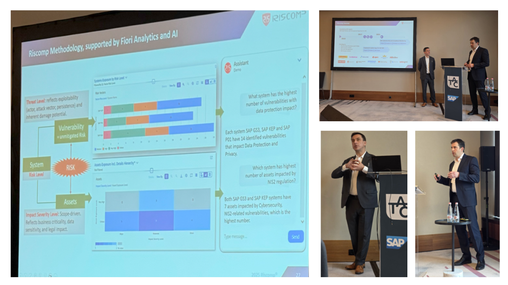 Maxim Chuprunov from Riscomp and Vincent Doux from SAP jointly presented the session, “SAP Cybersecurity and Compliance: A Collaborative Endeavor, Assisted by GRC and AI.” In this session, Maxim and Vincent shared practical insights and elaborated on a streamlined approach for monitoring SAP vulnerabilities and achieving and maintaining compliance with NIS2 and other regulations. They showed how all the dots can be connected, making SAP cybersecurity and compliance a team sport.