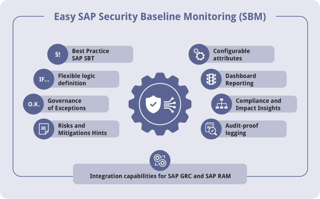 Unsere Lösung – SAP Security Baseline Monitoring (SBM) – adressiert alle oben genannten und viele weitere Herausforderungen. Die SPM Lösung ist vorkonfiguriert und verfügt über ein SAP Security Baseline Template (SBT), welches eine Echtzeitüberwachung der SAP-Parameter ermöglicht. SPM bietet eine intelligente, kostengünstige Compliance, die nicht nur die Sicherheit Ihrer SAP-Landschaft verbessert, sondern auch einen guten Überblick über SAP-Parameter im Kontext Ihrer Organisation und Ihrer Risikobereitschaft bietet.