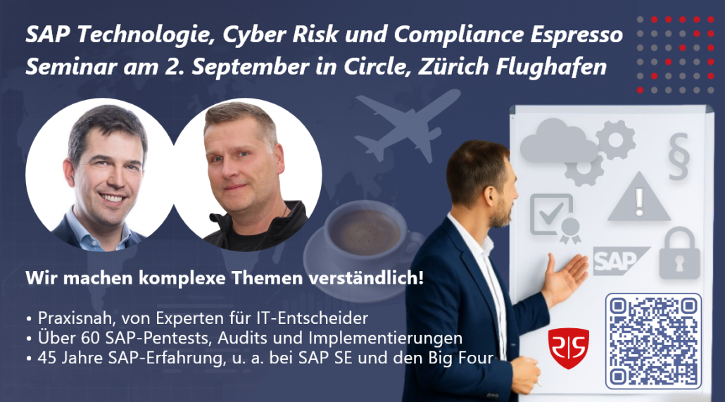 To support this growing need, we kindly invite you to our seminar “SAP Technologie, Cyber Risk und Compliance Espresso” on September 2 at The Circle, Zurich Airport – a one-day format with practical insights, real-life examples, and expert guidance.
